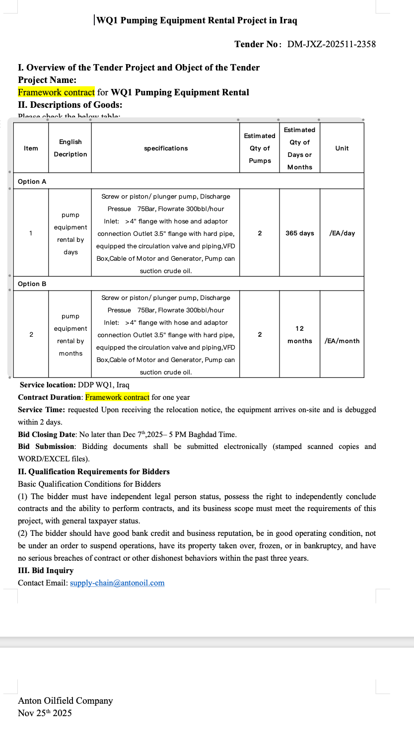 WQ1 Pumping Equipment Rental Project in Iraq
